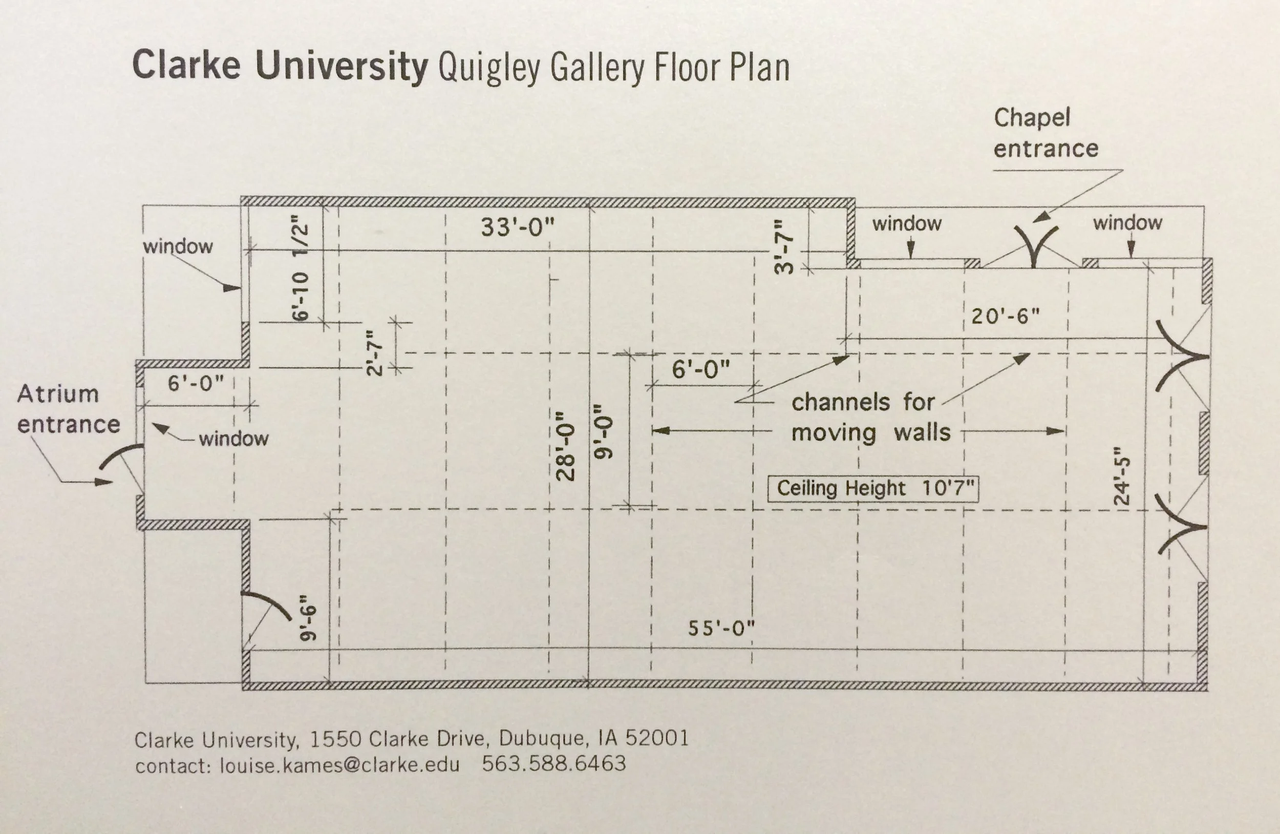 Quigley Gallery is positioned just off the atrium of Clarke University with a second set of doors opening directly across from the doors of the chapel.