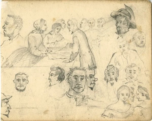 Image source: WisconsinHistory.org. Alexander Simplot drawing, various sketches of people’s faces